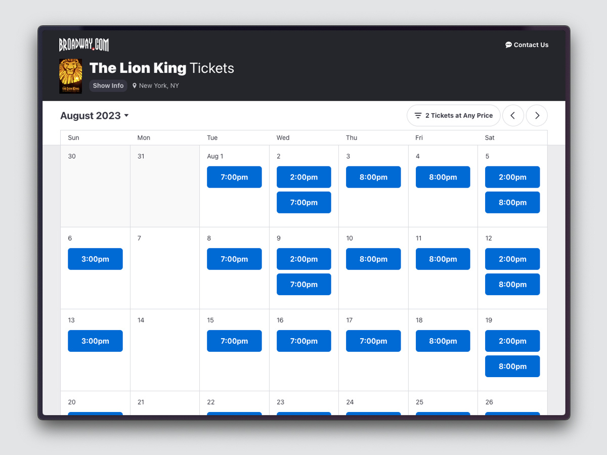 You may be looking to explore a variety of shows and possible performance dates. Our Broadway Tickets by Date feature is super helpful in assisting customers filter shows by date, ticket price, category, and ticket quantity over one or more dates.